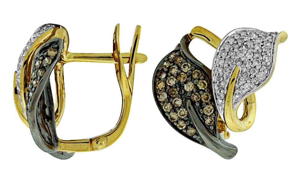14KT YELLOW GOLD LEVERBACK HANGING EARRINGS. 3D DOUBLE LEAF DESIGN. WHITE DIAMONDS ARE F/G COLOR, VSSI CLARITY .36 CARATS. MOCHA DIMAONDS ARE .55 CARATS. WRITTEN APPRAISAL AVAILABLE. COMES IN A PRESENTABLE GIFT BOX.