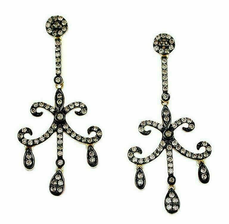 14KT YELLOW GOLD HANGING EARRINGS. 3D FLEUR DE LIS CHANDELIER DESIGN. CHOCOLATE FANCY DIAMONDS ARE VSSI CLARITY .92 CARATS. WRITTEN APPRAISAL AVAILABLE. COMES IN A PRESENTABLE GIFT BOX.