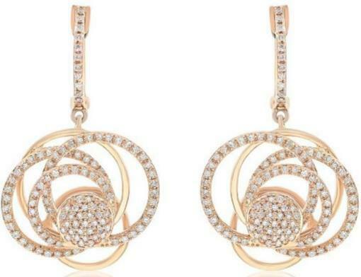 14KT ROSE GOLD FUNHANGING EARRINGS. 3D MULTI CIRCULAR INTERTWINING CLUSTERDESIGN. DIAMONDS ARE F/G COLOR, VSSI CLARITY .93 CARATS. WRITTEN APPRAISAL AVAILABLE. COMES IN A PRESENTABLE GIFT BOX.