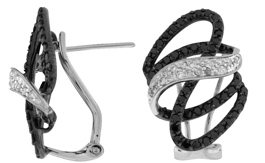 14KT WHITE GOLD CLIP ON HANGING EARRINGS. 3D LOVE KNOT DESIGN. WHITE DIAMONDS ARE F/G COLOR, VSSI CLARITY .16 CARATS. BLACK DIAMONDS ARE .77 CARATS. WRITTEN APPRAISAL AVAILABLE. COMES IN A PRESENTABLE GIFT BOX.