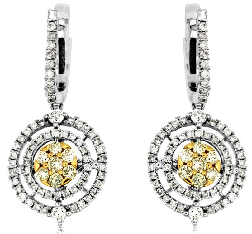 .93CT WHITE & FANCY YELLOW DIAMOND 14KT WHITE GOLD 3D CIRCULAR HANGING EARRINGS