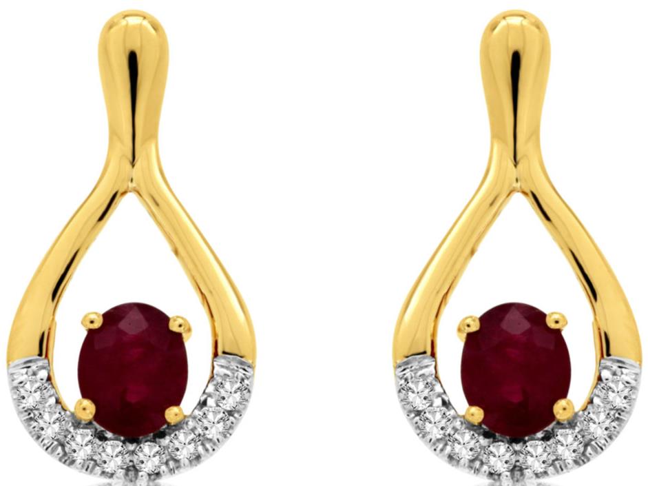 14KT YELLOW GOLD HANGING EARRINGS. 3D CLASSIC TEAR DROP DESIGN. ROUND DIAMONDS ARE F/G COLOR, VSSI CLARITY .12 CARATS. AAA OVAL RUBIES ARE .82 CARATS. WRITTEN APPRAISAL AVAILABLE. COMES IN A PRESENTABLE GIFT BOX.