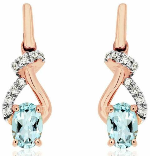 14KT WHITE AND ROSE GOLD HANGING EARRINGS. 3D CLASSIC INFINITY DESIGN. ROUND DIAMONDS ARE F/G COLOR, VSSI CLARITY .10 CARATS. AAA OVAL AQUAMARINES ARE .85 CARATS. WRITTEN APPRAISAL AVAILABLE. COMES IN A PRESENTABLE GIFT BOX.