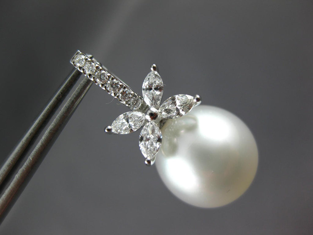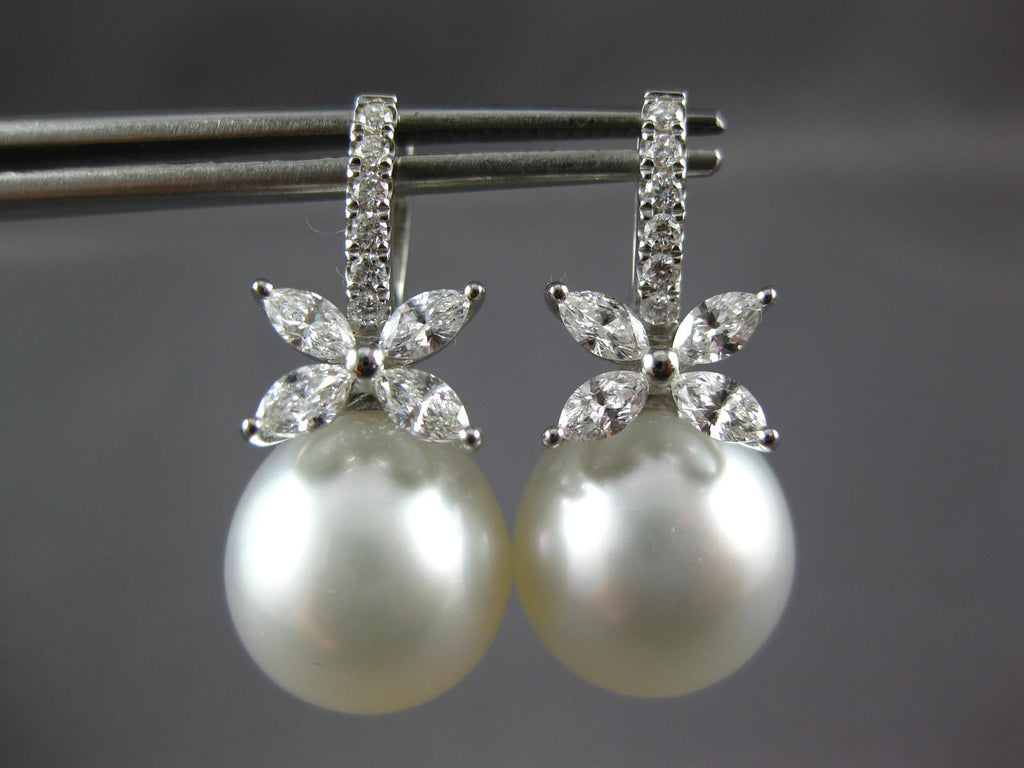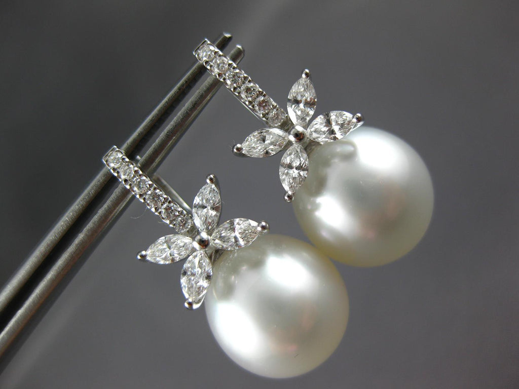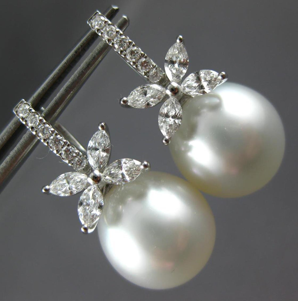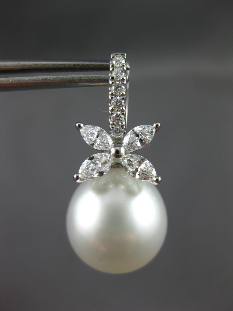 18KT WHITE GOLD HANGING EARRINGS. 3D FLOWER DESIGN. ROUND AND MARQUISE DIAMONDS ARE F/G COLOR, VSSI CLARITY .96 CARATS. FEATURES 12mm WIDE AAA SOUTH SEA PEARLS. EARRINGS MEASURE 26mm X 12mm. WRITTEN APPRAISAL AVAILABLE. COMES IN A PRESENTABLE GIFT BOX.
