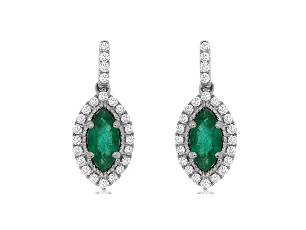 14KT WHITE GOLD HANGING EARRINGS. 3D CLASSIC HALO DESIGN. ROUND DIAMONDS ARE F/G COLOR, VSSI CLARITY .30 CARATS. AAA MARQUISE EMERALDS ARE .68 CARATS. WRITTEN APPRAISAL AVAILABLE. COMES IN A PRESENTABLE GIFT BOX.