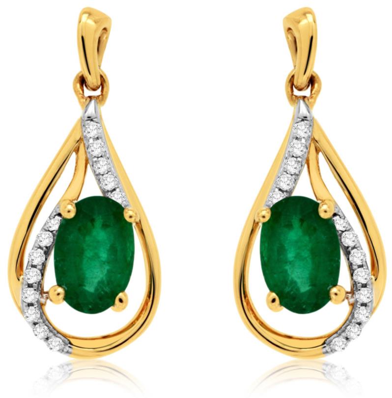 14KT YELLOW GOLD HANGING EARRINGS. 3D TEAR DROP DESIGN. ROUND DIAMONDS ARE F/G COLOR, VSSI CLARITY .10 CARATS. AAA OVAL EMERALDS ARE .88 CARATS. WRITTEN APPRAISAL AVAILABLE. COMES IN A PRESENTABLE GIFT BOX.