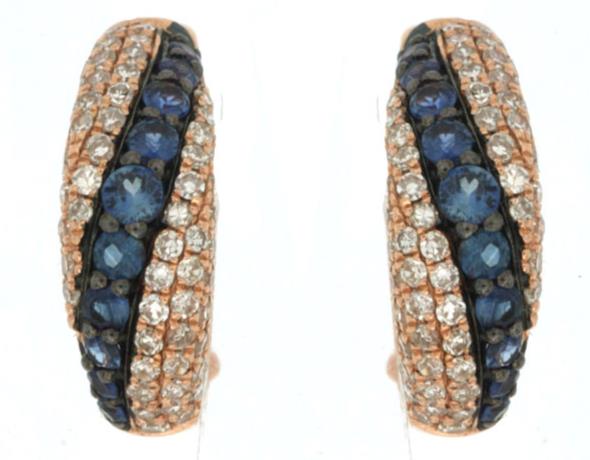 14KT ROSE GOLD FUN HANGING EARRINGS. 3D MULTI ROW DIAGONAL DESIGN. ROUND DIAMONDS ARE F/G COLOR, VSSI CLARITY .48 CARATS. AAA ROUND SAPPHIRES ARE .50 CARATS. WRITTEN APPRAISAL AVAILABLE. COMES IN A PRESENTABLE GIFT BOX.