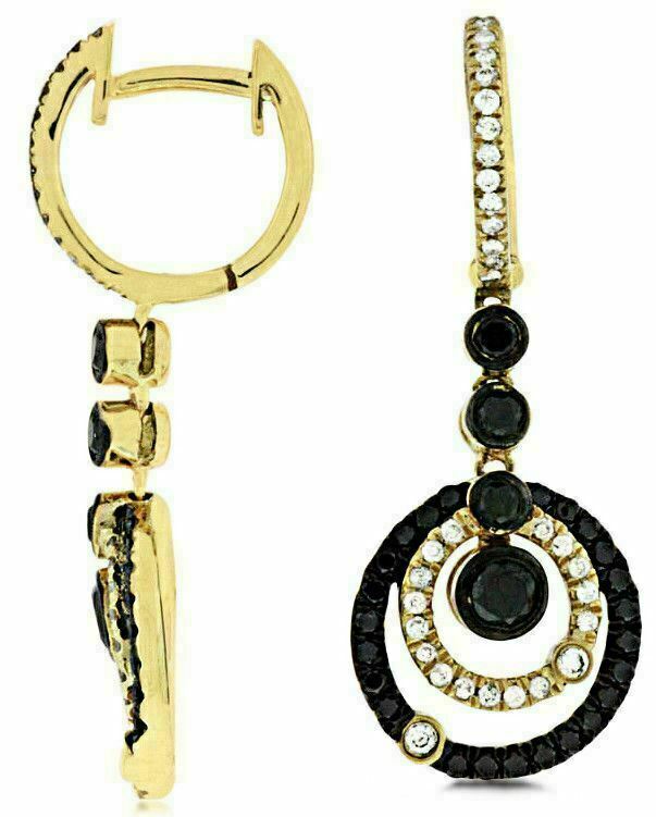14KT YELLOW GOLD HANGING EARRINGS. 3D CIRCLE OF LIFE JOURNEY DESIGN. WHITE DIAMONDS ARE F/G COLOR, VSSI CLARITY .28 CARATS. BLACK DIAMONDS ARE .70 CARATS. WRITTEN APPRAISAL AVAILABLE. COMES IN A PRESENTABLE GIFT BOX.