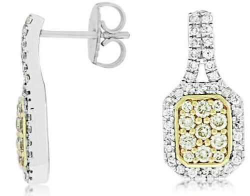 14KT WHITE GOLD HANGING EARRINGS. 3D CLUSTER SQUARE HALO DESIGN. WHITE DIAMONDS ARE F/G COLOR, VSSI CLARITY .43 CARATS. FANCY YELLOW DIAMONDS ARE .55 CARATS. WRITTEN APPRAISAL AVAILABLE. COMES IN A PRESENTABLE GIFT BOX.