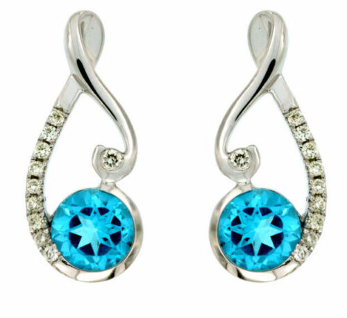 14KT WHITE GOLD LOVE HANGING EARRINGS. 3D INFINITY DESIGN. ROUND DIAMONDS ARE F/G COLOR, VSSI CLARITY .09 CARATS. AAA ROUND BLUE TOPAZ ARE .90 CARATS. WRITTEN APPRAISAL AVAILABLE. COMES IN A PRESENTABLE GIFT BOX.