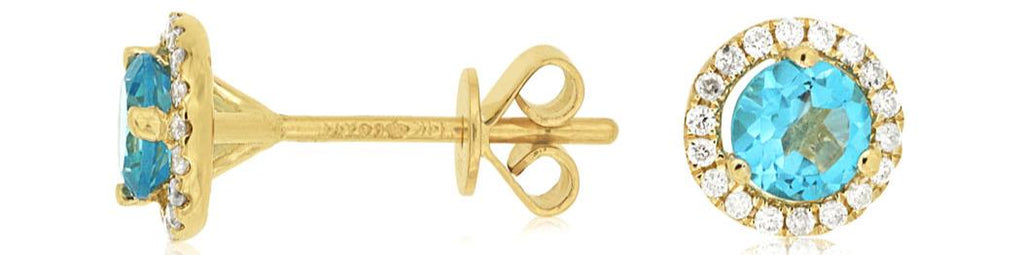 14KT YELLOW GOLD STUD EARRINGS. 3D HALO CLASSIC DESIGN. DIAMONDS ARE F/G COLOR, VSSI CLARITY .14 CARATS. AAA EXTRA FACETED ROUND BLUE TOPAZ ARE .85 CARATS. WRITTEN APPRAISAL AVAILABLE. COMES IN A PRESENTABLE GIFT BOX.