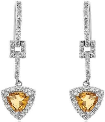 14KT WHITE GOLD HANGING EARRINGS. 3D CLASSICDESIGN. ROUND DIAMONDS ARE F/G COLOR, VSSI CLARITY .34 CARATS.AAA TRILLION CUTCITRINES ARE .65 CARATS. WRITTEN APPRAISAL AVAILABLE. COMES IN A PRESENTABLE GIFT BOX.