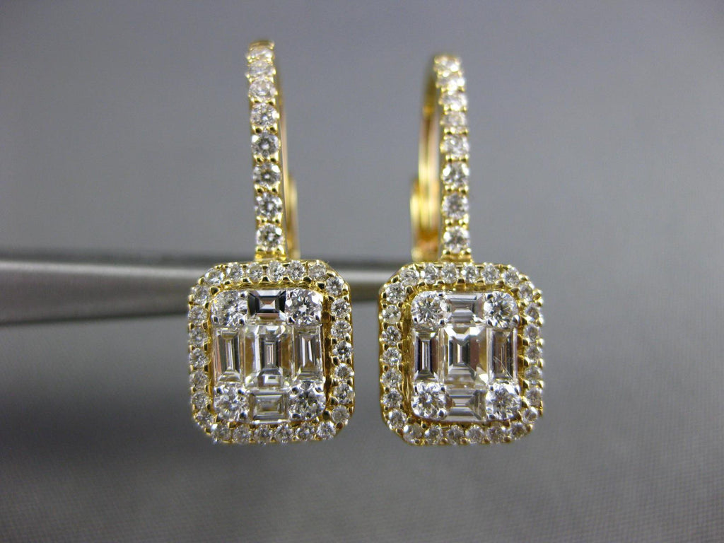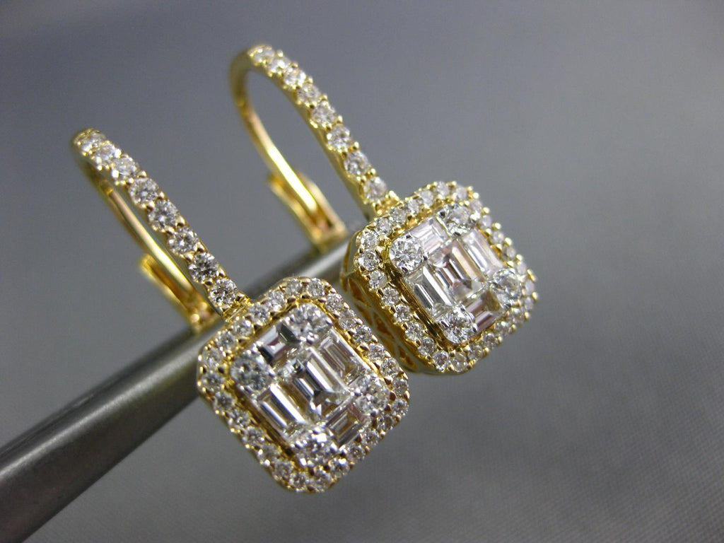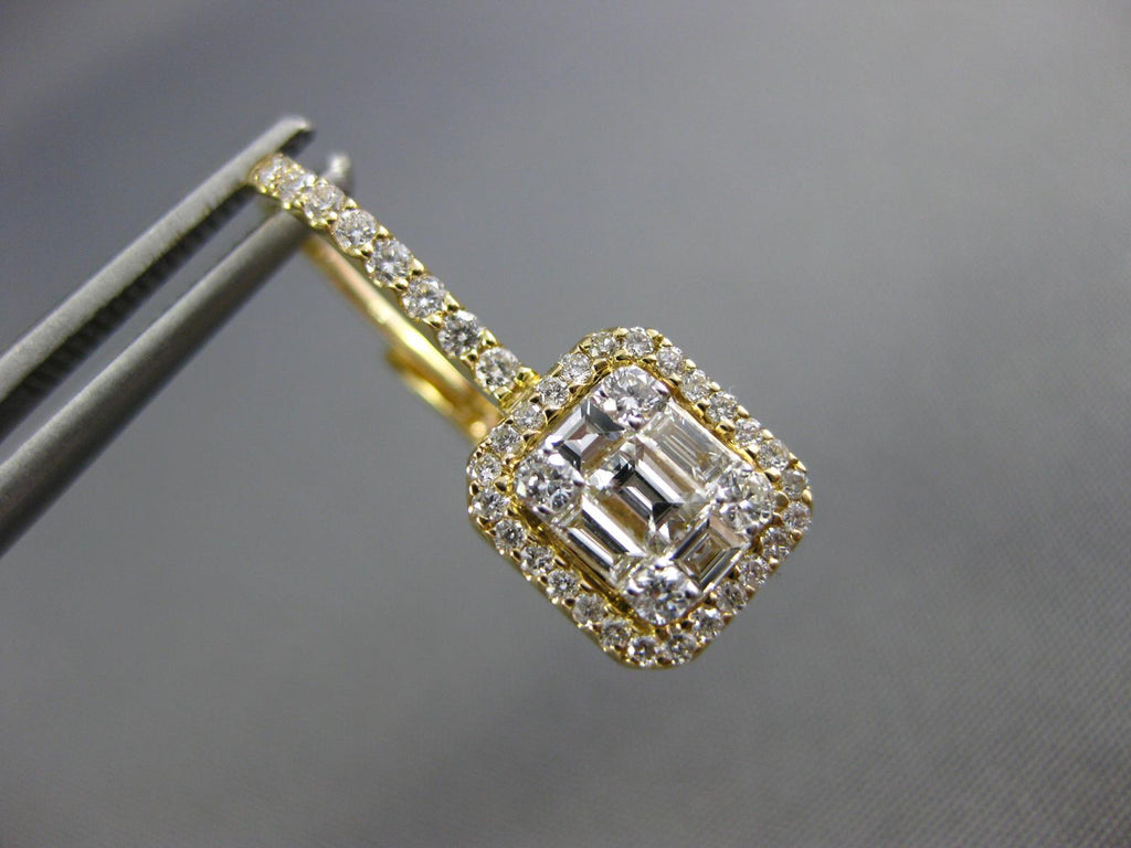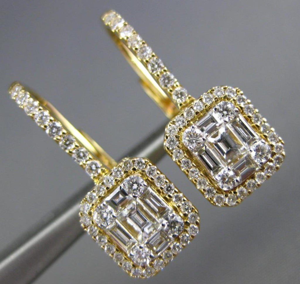 18KT YELLOW GOLD LEVERBACK HANGING EARRINGS. 3D CLUSTER SQUARE HALO DESIGN. DIAMONDS ARE F/G COLOR, VSSI CLARITY. ROUND DIAMONDS ARE .49 CARATS. BAGUETTE DIAMONDS ARE .40 CARATS. MEASURES 8mm X 21mm. WRITTEN APPRAISAL AVAILABLE. COMES IN A PRESENTABLE GIFT BOX.