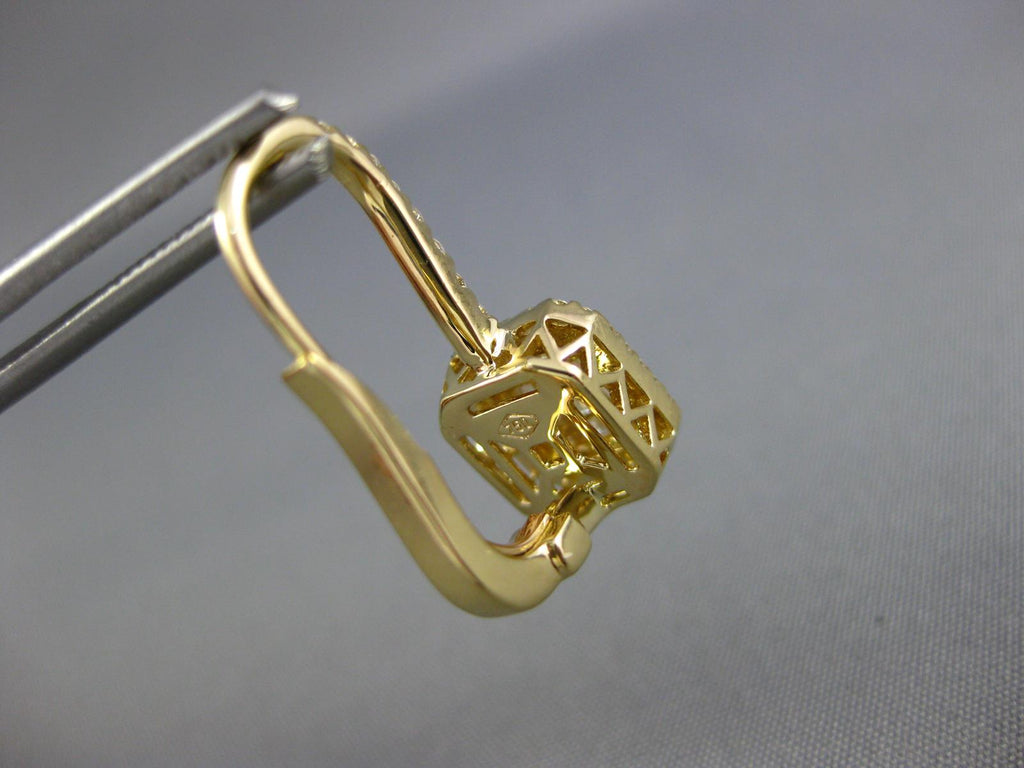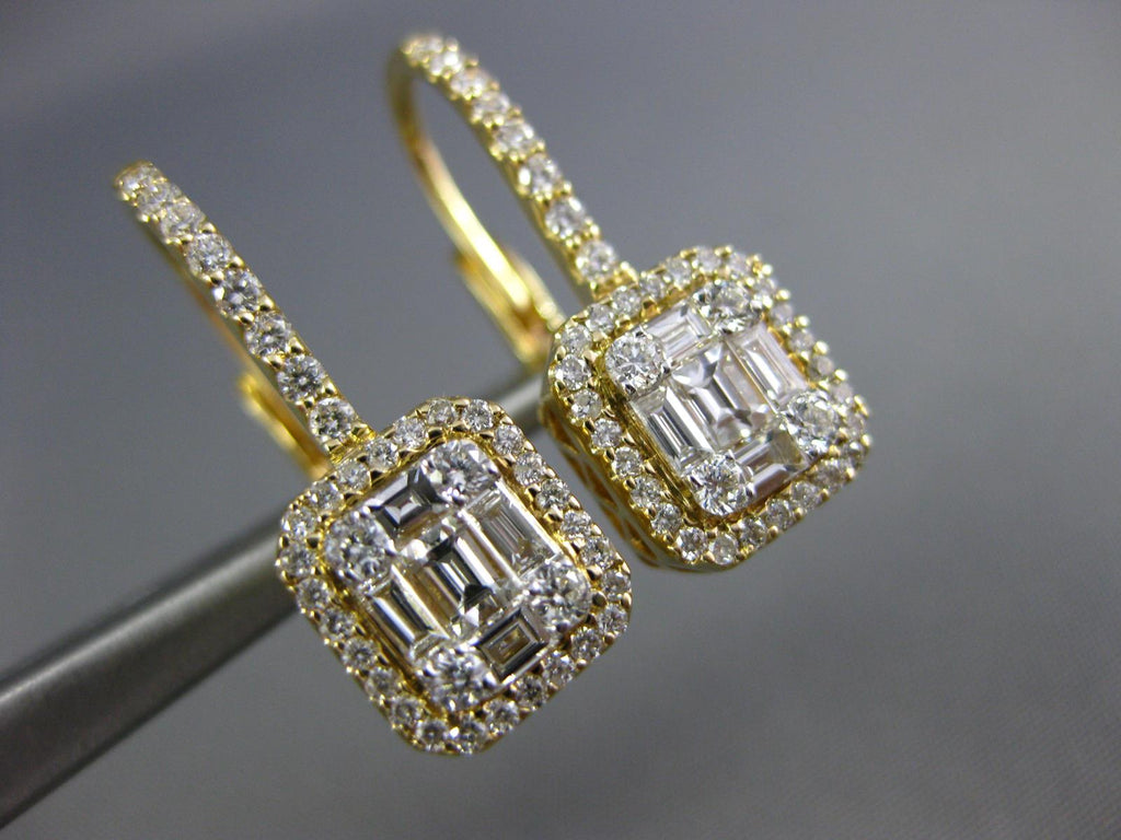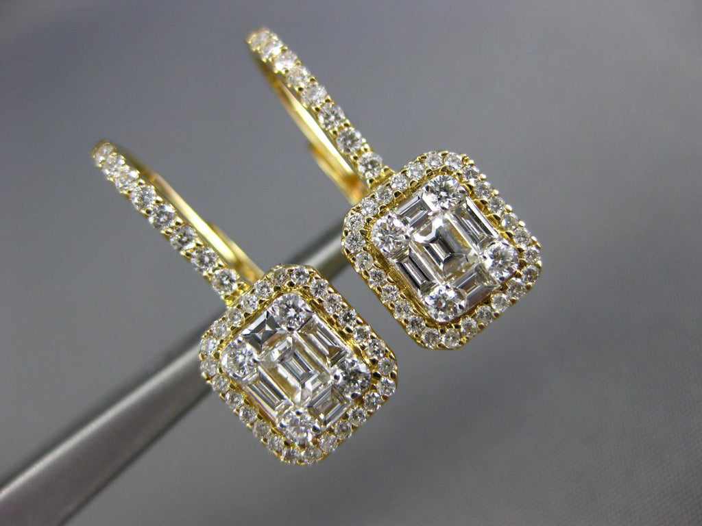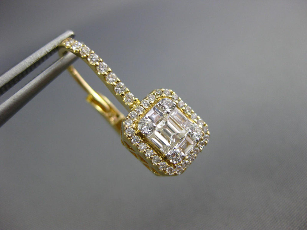 18KT YELLOW GOLD LEVERBACK HANGING EARRINGS. 3D CLUSTER SQUARE HALO DESIGN. DIAMONDS ARE F/G COLOR, VSSI CLARITY. ROUND DIAMONDS ARE .49 CARATS. BAGUETTE DIAMONDS ARE .40 CARATS. MEASURES 8mm X 21mm. WRITTEN APPRAISAL AVAILABLE. COMES IN A PRESENTABLE GIFT BOX.