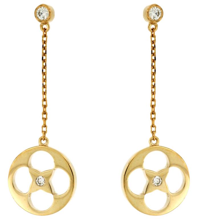 ESTATE 14KT YELLOW GOLD HANGING EARRINGS. 3D ETOILE FLOWER STAR DESIGN. DIAMONDS ARE F/G COLOR, VSSI CLARITY 0.09 CARATS. WRITTEN APPRAISAL AVAILABLE. COMES IN A PRESENTABLE GIFT BOX.
