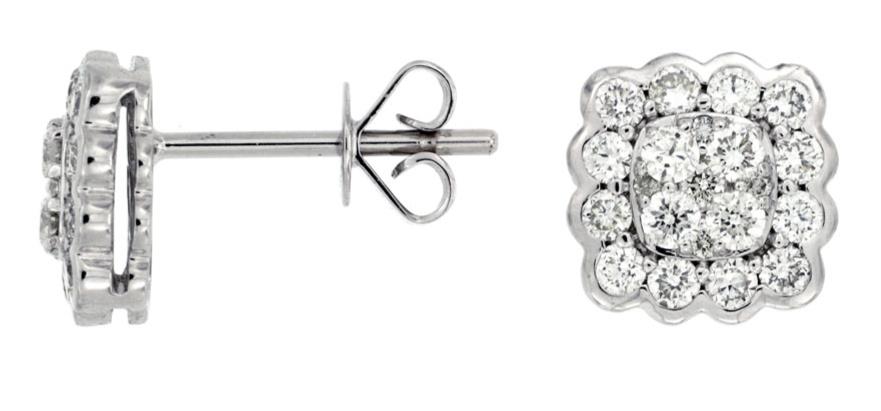 ESTATE 14KT WHITE GOLD STUD EARRINGS. 3D SEMI BEZEL FLOWER SQUAREDESIGN. ROUND DIAMONDS ARE F/G COLOR, VSSI CLARITY 0.70 CARATS. WRITTEN APPRAISAL AVAILABLE. COMES IN A PRESENTABLE GIFT BOX.