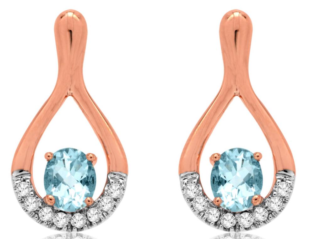 ESTATE 14KT ROSE GOLD HANGING EARRINGS. 3D TEAR DROP DESIGN. ROUND DIAMONDS ARE F/G COLOR, VSSI CLARITY 0.12 CARATS. AAA OVAL AQUAMARINE ARE 0.62 CARATS. WRITTEN APPRAISAL AVAILABLE. COMES IN A PRESENTABLE GIFT BOX.