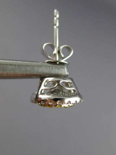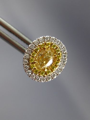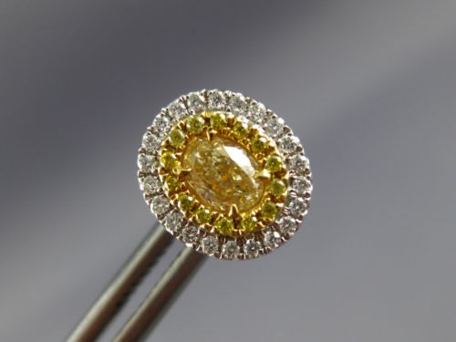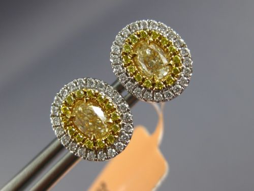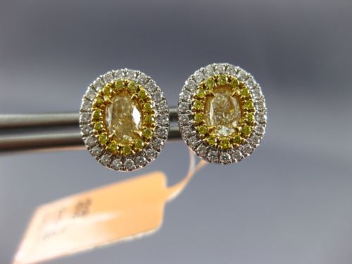 ESTATE 18KT WHITE AND YELLOW GOLD STUD EARRINGS. 3D OVAL DOUBLE HALO CLASSIC DESIGN. DIAMONDS ARE F/G COLOR, VSSI CLARITY .33 CARATS. FANCY YELLOW DIAMONDS ARE .69 CARATS. MEASURES 10mm X 9mm. WRITTEN APPRAISAL AVAILABLE. COMES IN A PRESENTABLE GIFT BOX.