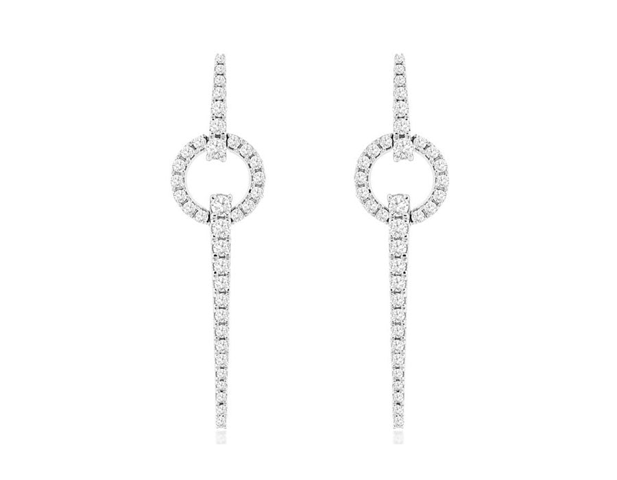 ESTATE 14KT WHITE GOLD HANGING EARRINGS. 3D CIRCLE OF LIFE BAR DESIGN. ROUND DIAMONDS ARE F/G COLOR, VSSI CLARITY 1.0 CARAT. WRITTEN APPRAISAL AVAILABLE. COMES IN A PRESENTABLE GIFT BOX.