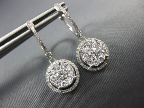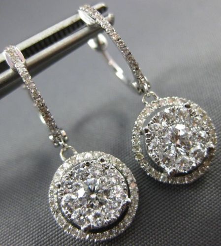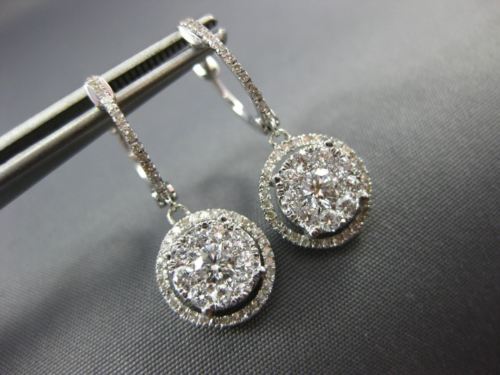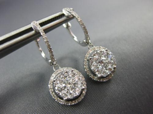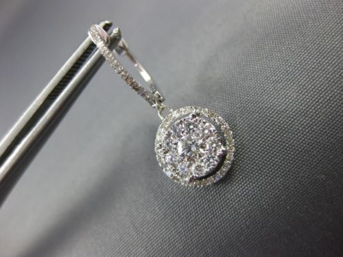 ESTATE 14KT WHITE GOLD HUGGIE HANGING EARRINGS. 3D CLASSIC HALO CLUSTER DESIGN. ROUND DIAMONDS ARE F/G COLOR, VSSI CLARITY 1.0 CARAT. MEASURES 25mm X 10mm. WRITTEN APPRAISAL AVAILABLE. COMES IN A PRESENTABLE GIFT BOX.