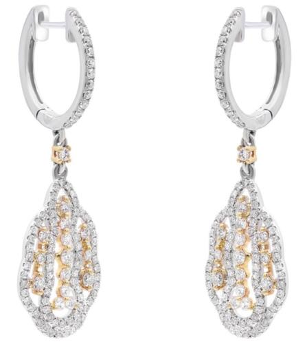 ESTATE 18KT WHITE AND YELLOW GOLD HUGGIE HANGING EARRINGS. 3D FLORAL DESIGN. ROUND DIAMONDS ARE F/G COLOR, VSSI CLARITY 1.0 CARAT. WRITTEN APPRAISAL AVAILABLE. COMES IN A PRESENTABLE GIFT BOX.