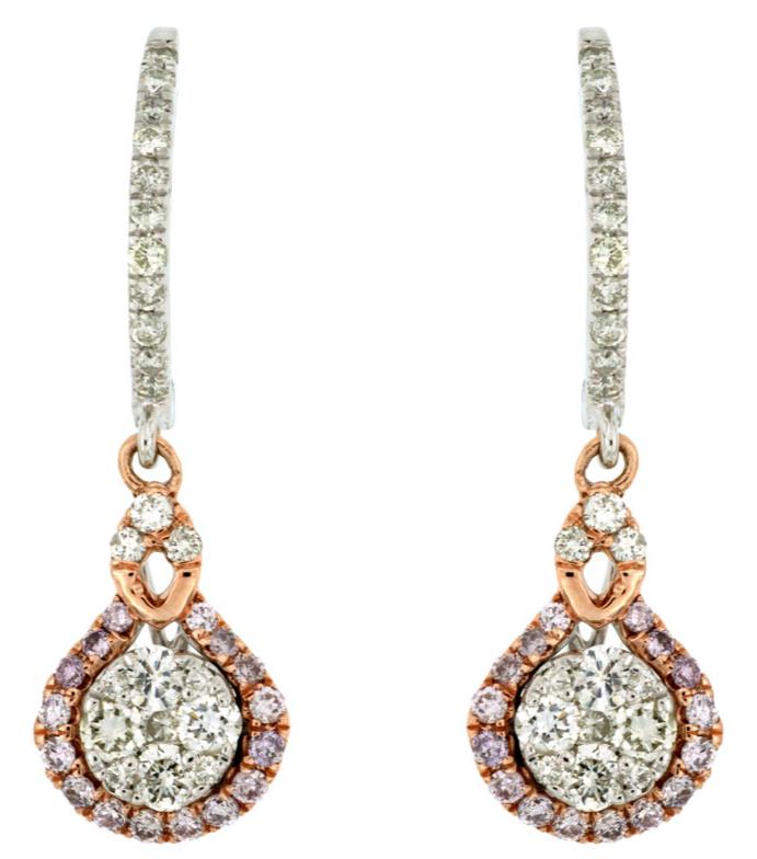 ESTATE 14KT WHITE GOLD HANGING EARRINGS. 3D CLUSTER FLOWER TEAR DROPDESIGN. DIAMONDS ARE F/G COLOR, VSSI CLARITY 0.70 CARATS. PINK DIAMONDS ARE 0.30 CARATS.WRITTEN APPRAISAL AVAILABLE. COMES IN A PRESENTABLE GIFT BOX.