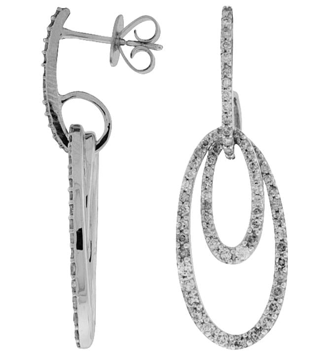 ESTATE 14KT WHITE GOLD HANGING EARRINGS. 3D DOUBLE OVAL DESIGN. DIAMONDS ARE F/G COLOR, VSSI CLARITY 1.10 CARATS. WRITTEN APPRAISAL AVAILABLE. COMES IN A PRESENTABLE GIFT BOX.