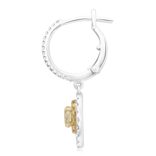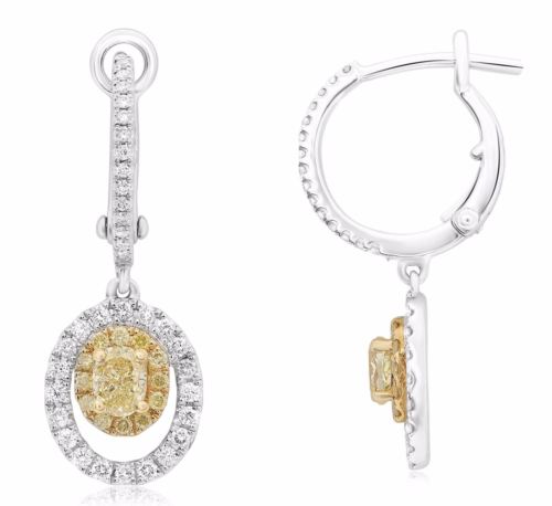 ESTATE 18KT WHITE AND YELLOW GOLD LEVER BACK HANGING EARRINGS. 3D DOUBLE HALO DESIGN. DIAMONDS ARE F/G COLOR, VSSI CLARITY .42 CARATS. FANCY YELLOW DIAMONDS ARE .72 CARATS. MEASURES 6.5mm WIDE. WRITTEN APPRAISAL AVAILABLE. COMES IN A PRESENTABLE GIFT BOX.
