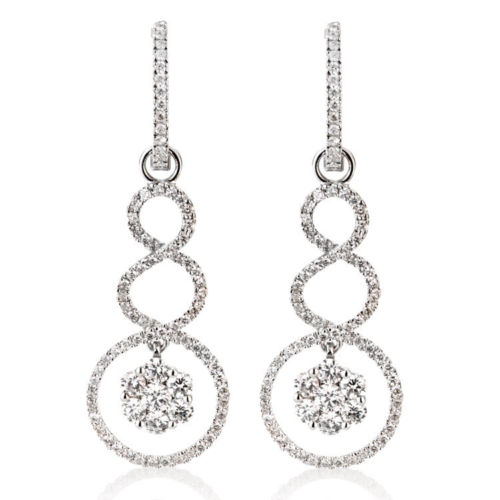 ESTATE 18KT WHITE GOLD HANGING EARRINGS. 3D CLASSIC ROUND INFINITY FLOWER CIRCULAR DESIGN. DIAMONDS ARE F/G COLOR, VSSI CLARITY 1.15 CARATS. WRITTEN APPRAISAL AVAILABLE. COMES IN A PRESENTABLE GIFT BOX.