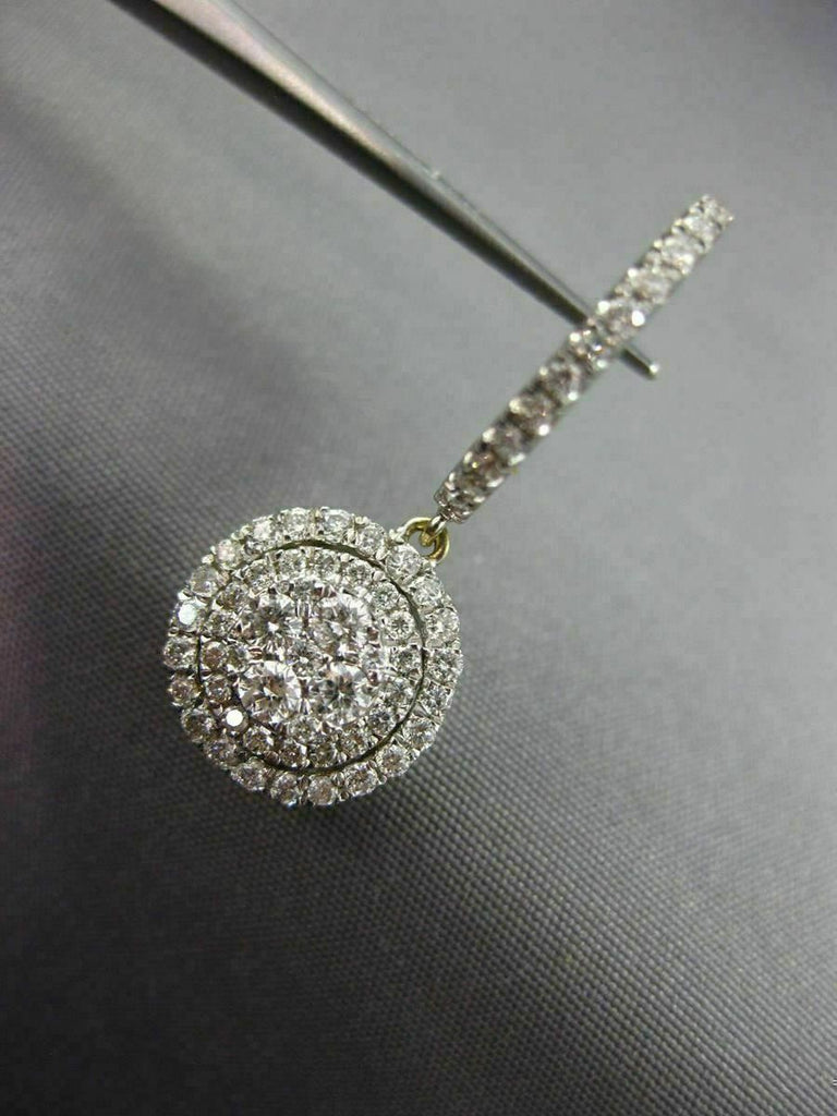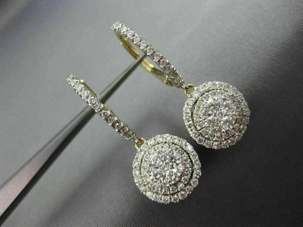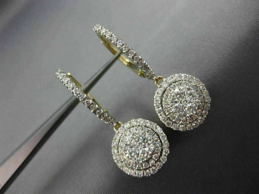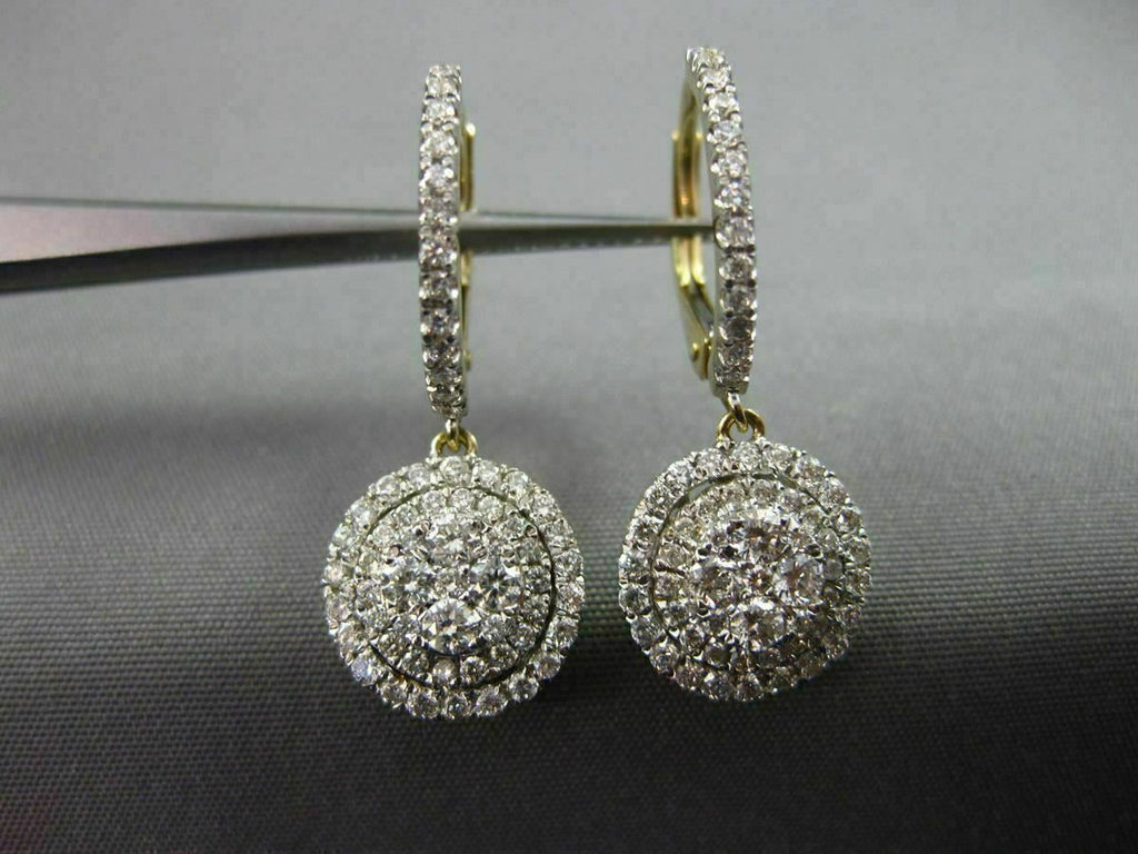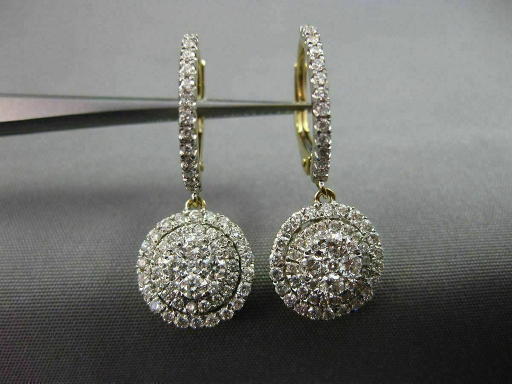 ESTATE 14KT YELLOW LEVERBACK HANGING EARRINGS. 3D CLUSTER DOUBLE HALO ROUND DESIGN. DIAMONDS ARE F/G COLOR, VSSI CLARITY 1.16 CARATS. MEASURES 26mm X 10mm. WRITTEN APPRAISAL AVAILABLE. COMES IN A PRESENTABLE GIFT BOX