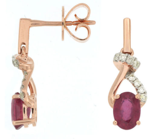 ESTATE 14KT ROSE GOLD HANGING EARRINGS. 3D LOVE KNOT DESIGN. ROUND DIAMONDS ARE F/G COLOR, VSSI CLARITY .10 CARATS. AAA OVAL RUBIES ARE 1.10 CARATS. WRITTEN APPRAISAL AVAILABLE. COMES IN A PRESENTABLE GIFT BOX.