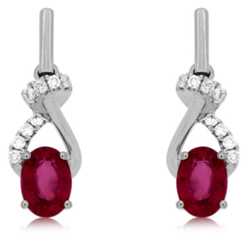 ESTATE 14KT WHITE GOLD HANGING EARRINGS. 3D CLASSIC ROUND & OVAL LOVE KNOT TEAR DROP DESIGN. DIAMONDS ARE F/G COLOR, VSSI CLARITY .10 CARATS. AAA RUBY ARE 1.10 CARATS. WRITTEN APPRAISAL AVAILABLE. COMES IN A PRESENTABLE GIFT BOX.