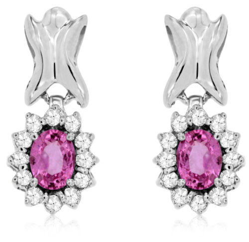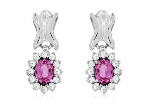 ESTATE 14KT WHITE GOLD HANGING EARRINGS. 3D FLOWER HALO DESIGN. DIAMONDS ARE F/G COLOR, VSSI CLARITY, .32 CARATS. AAA OVAL PINK SAPPHIRES ARE .90 CARATS. WRITTEN APPRAISAL AVAILABLE. COMES IN A PRESENTABLE GIFT BOX.