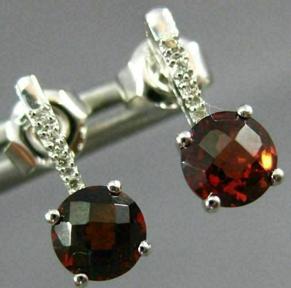 ESTATE 14KT WHITE GOLD HANGING EARRINGS. 3D CLASSIC DESIGN. DIAMONDS ARE F/G COLOR, VSSI CLARITY .03 CARATS. AAA ROUND GARNETS ARE 1.20 CARATS. MEASURES 12mm X 4mm. WRITTEN APPRAISAL AVAILABLE. COMES IN A PRESENTABLE GIFT BOX.
