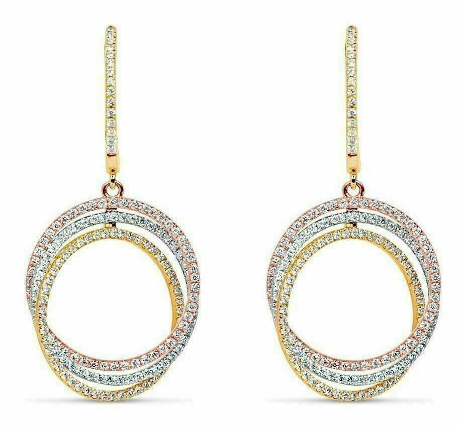 ESTATE 18KT WHITE YELLOW AND ROSE GOLD HANGING LOVE EARRINGS. 3D CIRCULAR INTERTWINING DESIGN. DIAMONDS ARE F/G COLOR, VSSI CLARITY 1.24 CARATS. WRITTEN APPRAISAL AVAILABLE. COMES IN A PRESENTABLE GIFT BOX