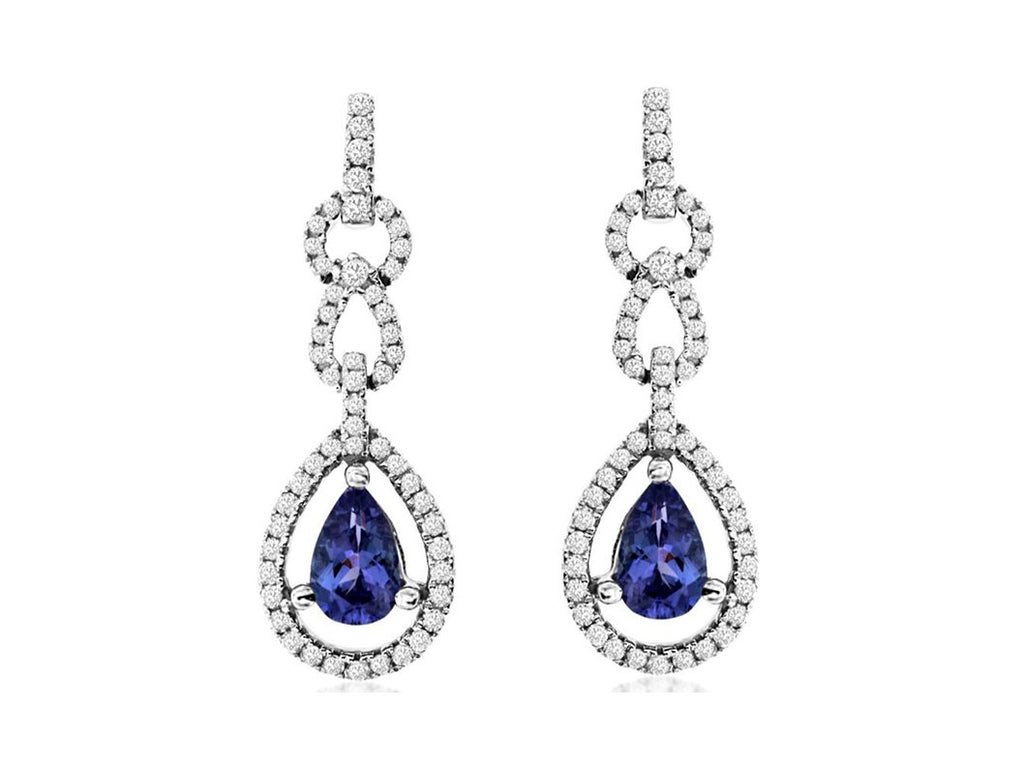 ESTATE 14KT WHITE GOLD HANGING EARRINGS. 3D TEAR DROP LOVE KNOT DESIGN. ROUND DIAMONDS ARE F/G COLOR, VSSI CLARITY .40 CARATS. AAA EXTRA FACETED PEAR SHAPE TANZANITE ARE .84 CARATS. WRITTEN APPRAISAL AVAILABLE. COMES IN A PRESENTABLE GIFT BOX.