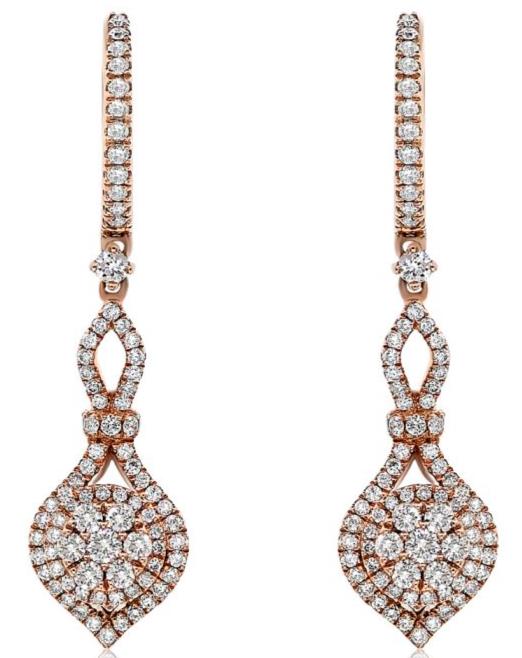ESTATE 14KT ROSE GOLD HANGINGEARRINGS. 3D CLUSTER FLOWER INFINITYDESIGN. DIAMONDS ARE F/G COLOR, VSSI CLARITY 1.25CARATS. WRITTEN APPRAISAL AVAILABLE. COMES IN A PRESENTABLE GIFT BOX.