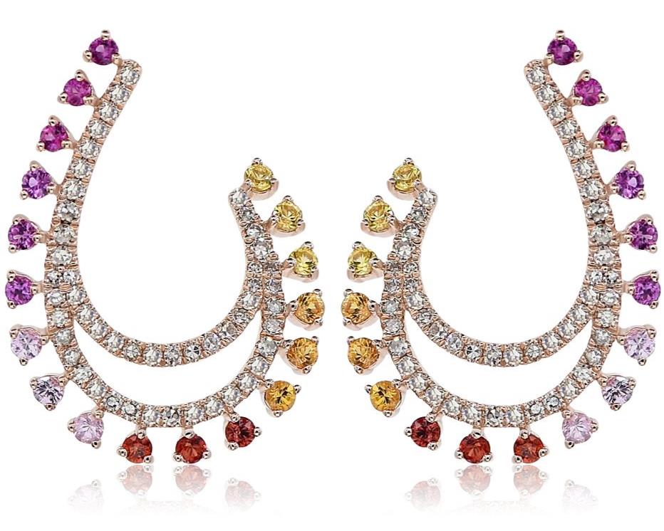 ESTATE 14KT ROSE GOLD LOVE HANGING EARRINGS. 3D PEAR SHAPE DESIGN. DIAMONDS ARE F/G COLOR, VSSI CLARITY .38 CARATS. AAA MULTI COLOR SAPPHIRES ARE .90 CARATS. WRITTEN APPRAISAL AVAILABLE. COMES IN A PRESENTABLE GIFT BOX.