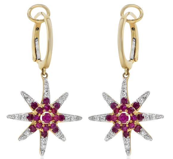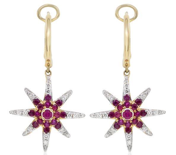ESTATE14KT YELLOWGOLD FUNHANGING EARRINGS. 3D FLOWERDESIGN. DIAMONDS ARE F/G COLOR, VSSI CLARITY .20 CARATS. AAARUBIES ARE1.10 CARATS.WRITTEN APPRAISAL AVAILABLE. COMES IN A PRESENTABLE GIFT BOX.