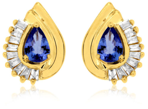 ESTATE 14KT YELLOW GOLD STUD EARRINGS. 3D CLASSIC TEAR DROP DESIGN. DIAMONDS ARE F/G COLOR, VSSI CLARITY, .30 CARATS. AAA PEAR SHAPE TANZANITES ARE 1.0 CARATS. WRITTEN APPRAISAL AVAILABLE. COMES IN A PRESENTABLE GIFT BOX.
