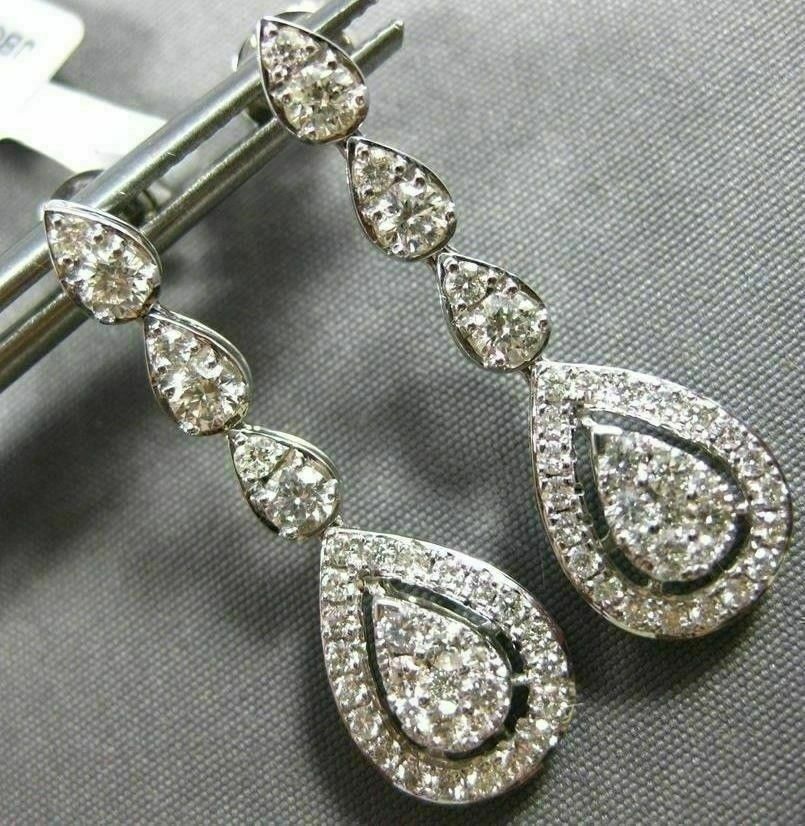 ESTATE 14KT WHITE GOLD HANGING EARRINGS. 3D CLUSTER TEAR DROP HALO DESIGN. DIAMONDS ARE F/G COLOR, VSSI CLARITY 1.32 CARATS. MEASURES 31mm X 9mm. WRITTEN APPRAISAL AVAILABLE. COMES IN A PRESENTABLE GIFT BOX