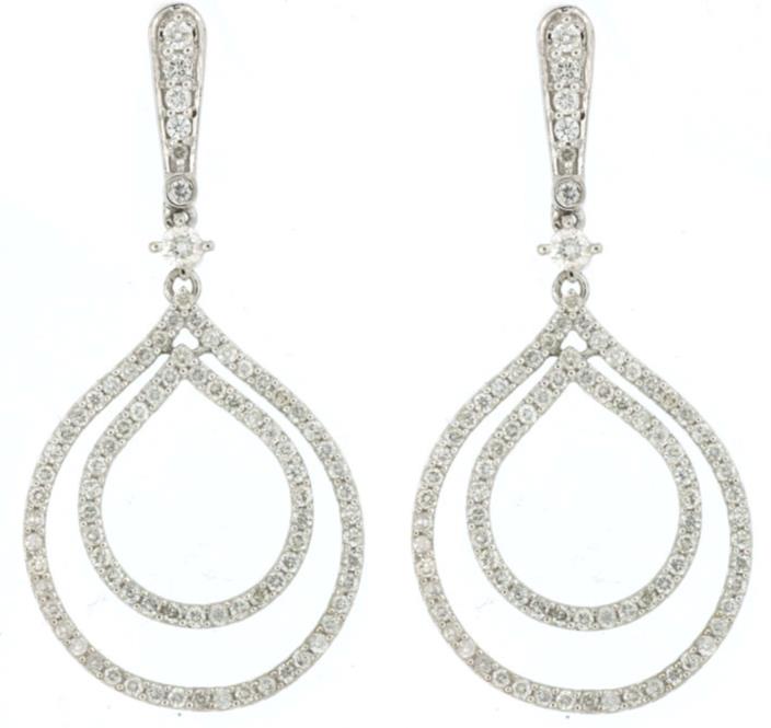 ESTATE 14KT WHITE GOLD FUN HANGING EARRINGS. 3D CLASSIC DOUBLE TEAR DROP DESIGN. DIAMONDS ARE F/G COLOR, VSSI CLARITY 1.32 CARATS. WRITTEN APPRAISAL AVAILABLE. COMES IN A PRESENTABLE GIFT BOX.