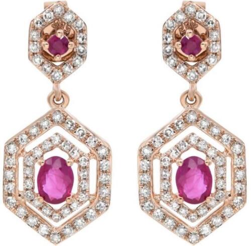 ESTATE 14KT ROSE GOLD FUN HANGING EARRINGS. 3D DOUBLE HEXAGON DESIGN. ROUND DIAMONDS ARE F/G COLOR, VSSI CLARITY .15 CARATS. AAA OVAL RUBIES ARE 1.20 CARATS. WRITTEN APPRAISAL AVAILABLE. COMES IN A PRESENTABLE GIFT BOX.