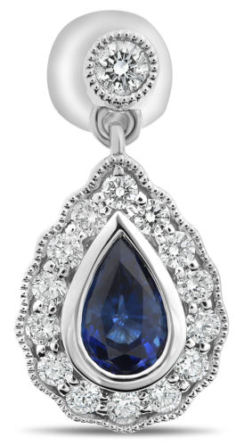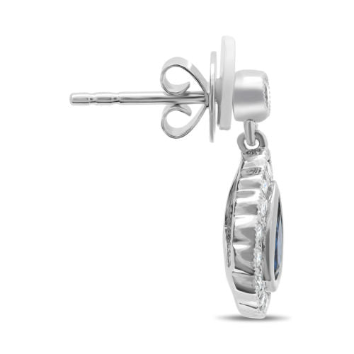 ESTATE 18KT WHITE GOLD HANGING EARRINGS. 3D CLASSIC TEAR DROP HALO DESIGN. DIAMONDS ARE F/G COLOR, VSSI CLARITY .46 CARATS. AAA PEAR SHAPE SAPPHIRES ARE .90 CARATS. MEASURES 19mm X 9mm. WRITTEN APPRAISAL AVAILABLE. COMES IN A PRESENTABLE GIFT BOX.