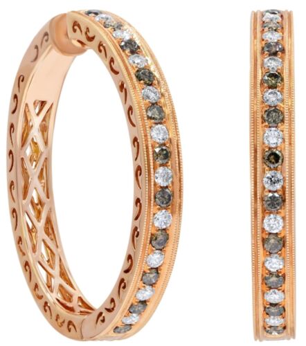 ESTATE 18KT ROSE GOLD HOOP HANGING EARRINGS. 3D CLASSIC FILIGREE DESIGN. ROUND WHITE DIAMONDS ARE F/G COLOR, VSSI CLARITY .64 CARATS. ROUND CHOCOLATE FANCY DIAMONDS ARE .74 CARATS. WRITTEN APPRAISAL AVAILABLE. COMES IN A PRESENTABLE GIFT BOX.