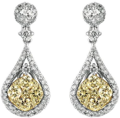 ESTATE 14KT WHITE GOLD HANGING EARRINGS. 3D CLASSIC FLOWER DESIGN. DIAMONDS ARE F/G COLOR, VSSI CLARITY. WHITE DIAMONDS ARE .62 CARATS. FANCY YELLOW DIAMONDS ARE .76 CARATS. WRITTEN APPRAISAL AVAILABLE. COMES IN A PRESENTABLE GIFT BOX.