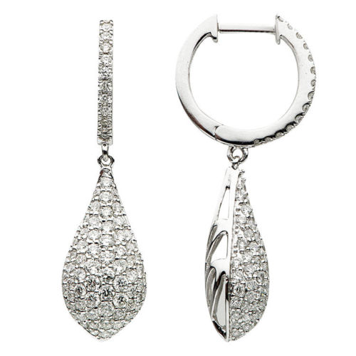 ESTATE 18KT WHITE GOLD HANGING EARRINGS. 3D CLASSIC TEAR DROP PAVE DESIGN. DIAMONDS ARE F/G COLOR, VSSI CLARITY 1.39 CARATS. WRITTEN APPRAISAL AVAILABLE. COMES IN A PRESENTABLE GIFT BOX.
