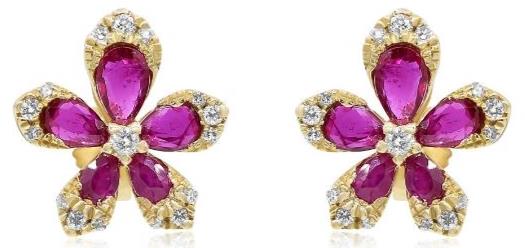 ESTATE 18KT YELLOWGOLD STUDEARRINGS. 3D FLOWERDESIGN. DIAMONDS ARE F/G COLOR, VSSI CLARITY .20CARATS. AAA RUBIESARE 1.22 CARATS.WRITTEN APPRAISAL AVAILABLE. COMES IN A PRESENTABLE GIFT BOX.