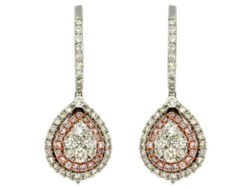 ESTATE 14KT WHITE AND ROSE GOLD HANGING EARRINGS. 3D CLASSIC CIRCULAR CLUSTER FLOWER  DESIGN. DIAMONDS ARE F/G COLOR, VSSI CLARITY .52 CARATS. PINK DIAMONDS ARE .94 CARATS. WRITTEN APPRAISAL AVAILABLE. COMES IN A PRESENTABLE GIFT BOX.