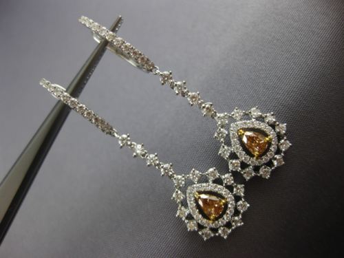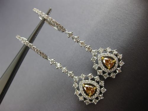 ESTATE 18KT WHITE AND YELLOW GOLD HANGING EARRINGS. 3D TEAR DROP DOUBLE HALO DESIGN. DIAMONDS ARE F/G COLOR, VSSI CLARITY 1.03 CARATS. CHOCOLATE FANCY DIAMONDS ARE .44 CARATS. MEASURES 40mm X 10mm. WRITTEN APPRAISAL AVAILABLE. COMES IN A PRESENTABLE GIFT BOX.